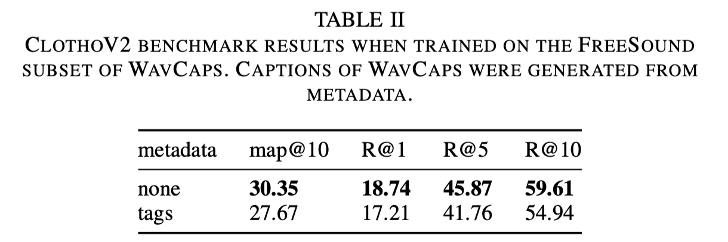 - 개방형(OS) 및 폐쇄형(CS) 태그를 결합한 데이터셋으로 훈련하면 ClothoV2 벤치마크에서 성능 향상 확인.