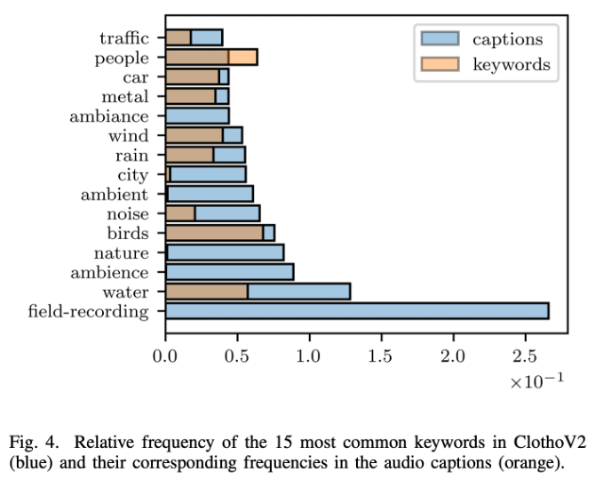 - ClothoV2 데이터셋에서 가장 많이 사용된 15개의 키워드의 상대적 빈도(relative frequency)