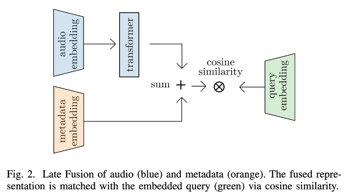 - 오디오와 메타데이터 임베딩의 late fusion이 mid-level fusion보다 나은 성능을 보임. 단순히 키워드와 설명을 직접 일치시키는 것이 오류 가능성이 적음.