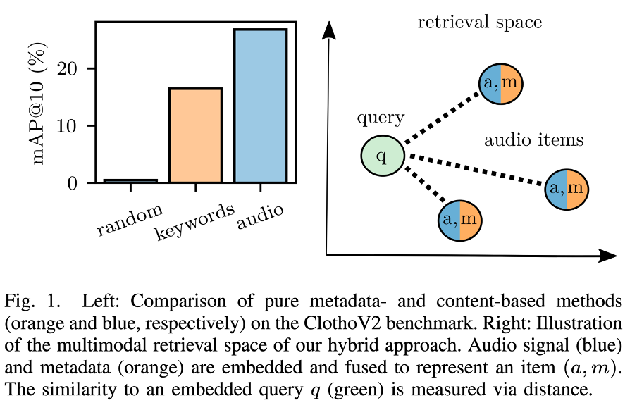오른쪽 그래프는 audio signal과 metadata가 embedded, fused 되어 audio items (a, m)으로 표현되고 있다. 이 audio items는 query와의 distance로 성능이 측정된다.