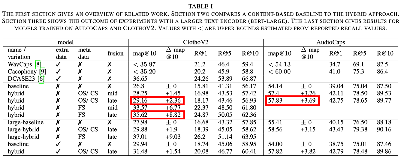 hybrid retrieval method는 훈련과 추론 시 오디오 녹음과 쿼리를 일치시키기 위해 추가 정보로서 사용 가능한 메타데이터를 사용한다.