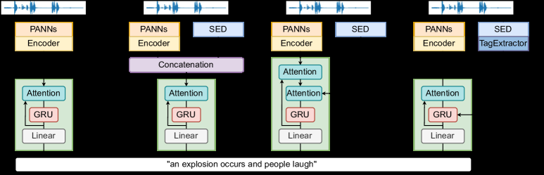두 번째로, 기존 연구의 temp-tag-AAC 모델을 재현하여 비교한다 ([2306.01533] Enhance Temporal Relations in Audio Captioning with Sound Event Detection). 여기에는 CNN-BiGRU 기반 SED와 GRU 디코더가 사용되고, 시간 태그를 첫 단어로 넣어 캡션을 생성한다. 이 모델은 이미 시간 표현 향상을 입증하였으므로, 우리의 개선된 temp-tag-AAC와 직접 비교함으로써 디코더 및 SED 업그레이드의 효과를 정량화할 수 있다. 추가로, 기존 연구에서 실험한 SED 직접 활용 방법들도 참고한다: SED 출력 확률을 인코더 출력과 결합한 모델(Cat-prob-AAC)과, 디코더에서 어텐션으로 SED 출력을 참고한 모델(Attn-prob-AAC) 등이 있으나 ([2306.01533] Enhance Temporal Relations in Audio Captioning with Sound Event Detection), 이들은 temp-tag-AAC보다 성능이 떨어지는 것으로 보고되었다. 필요시 이러한 방식에 최신 SED를 적용한 경우도 실험하여, 단순 확률 융합 vs. 태그 활용의 성능 차이가 여전히 유의한지 검증할 수 있다.