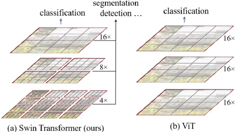 💡 Global self-attention computation (in standard ViT) is generally unaffordable for a large hw, while the window based self-attention is scalable.