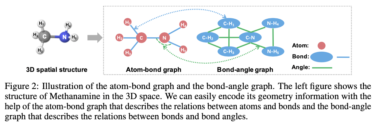 - 결합-각도 그래프 (Bond-angle graph): 결합을 노드로, 결합 각도를 엣지로 사용하여 결합과 결합 각도 간의 관계를 나타냅니다. GeoGNN은 이 두 그래프를 연결하기 위해 결합 표현 벡터를 사용합니다. 결합-각도 그래프에서 이웃 결합 및 해당 결합 각도로부터 메시지를 집계하여 결합 표현 벡터를 학습합니다. 그 다음, 학습된 결합 표현 벡터는 원자-결합 그래프의 엣지 특징으로 사용되어 원자 표현 벡터를 학습하는 데 도움을 줍니다. 최종적으로 원자 표현 벡터를 통합하여 분자 표현 벡터를 얻고 이를 특성 예측에 사용합니다.