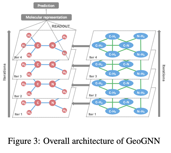 - 결합-각도 그래프 (Bond-angle graph): 결합을 노드로, 결합 각도를 엣지로 사용하여 결합과 결합 각도 간의 관계를 나타냅니다. GeoGNN은 이 두 그래프를 연결하기 위해 결합 표현 벡터를 사용합니다. 결합-각도 그래프에서 이웃 결합 및 해당 결합 각도로부터 메시지를 집계하여 결합 표현 벡터를 학습합니다. 그 다음, 학습된 결합 표현 벡터는 원자-결합 그래프의 엣지 특징으로 사용되어 원자 표현 벡터를 학습하는 데 도움을 줍니다. 최종적으로 원자 표현 벡터를 통합하여 분자 표현 벡터를 얻고 이를 특성 예측에 사용합니다.