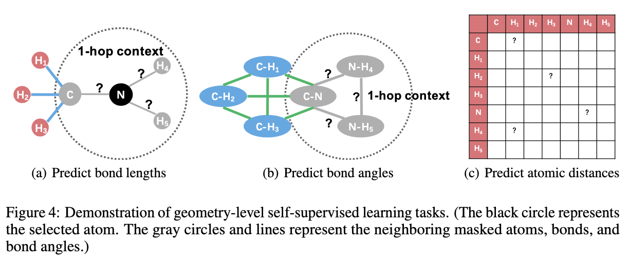 - 기하 수준 자체 지도 학습 전략: GeoGNN의 일반화 능력을 향상시키기 위해 다양한 기하 수준 자체 지도 학습 작업을 설계하여 공간 지식을 학습하도록 사전 학습합니다. 이러한 작업은 다음과 같습니다: