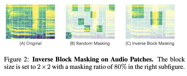 - 멀티 마스크 접근 방식: 효율성을 최적화하기 위해 동일한 스펙트로그램 패치에서 여러 역 블록 마스킹을 사용하여 여러 클론 마스크된 임베딩을 생성합니다. 이 변형들은 학생 모델에 동시에 입력되어 병렬 컴퓨팅을 통한 데이터 활용 효율성을 크게 높입니다.