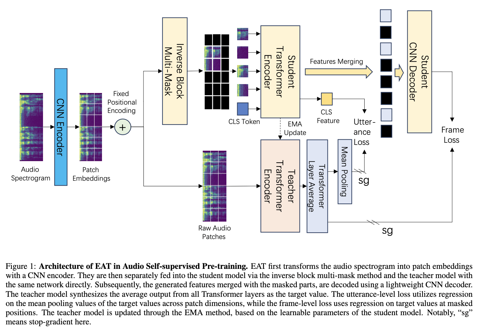 - 부트스트랩 자기 지도 학습 패러다임: EAT는 오디오 도메인에 부트스트랩 자기 지도 학습 패러다임을 적용합니다. 이는 BYOL에서 처음 도입된 개념으로, 타겟 인코더가 대표적인 타겟을 생성하고 예측기 네트워크(predictor network)가 입력의 증강된 버전을 사용하여 이 타겟을 예측하는 이중 구성 프레임워크를 포함합니다. EAT에서는 학생 모델이 교사 모델의 타겟 특성을 사용하여 지속적으로 업데이트되며, 교사 모델은 Momentum Contrast (MoCo)와 유사하게 EMA(지수 이동 평균) 기법을 통해 점진적으로 업데이트됩니다.