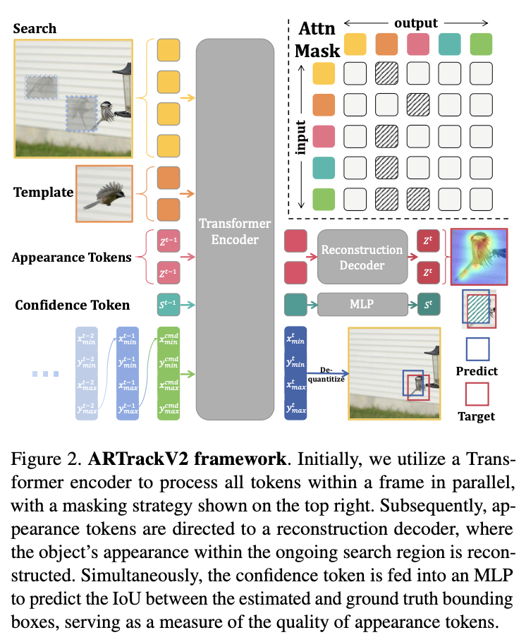 - ARTrackV2는 한 단계 더 나아가 궤적-외형 동시 자기회귀(joint trajectory-appearance autoregression)를 도입합니다. 추적기가 대상을 성공적으로 추적한다면, 객체의 위치를 "읽어낼" 뿐만 아니라 그 외형 변화도 "다시 말해야" 한다는 직관에 기반합니다. ARTrack의 궤적 시계열 모델링과 함께, 외형 프롬프트 세트를 사용하여 객체의 외형을 동시에 재구성하는 자기회귀 모델을 유지합니다. 이 토큰들은 동적 템플릿처럼 작동하며 어텐션 메커니즘을 통해 검색 영역과 상호작용합니다. 더 나아가, 시각적 특징 진화에 대한 이해를 요구하며 객체 외형을 재구축하도록 훈련됩니다.