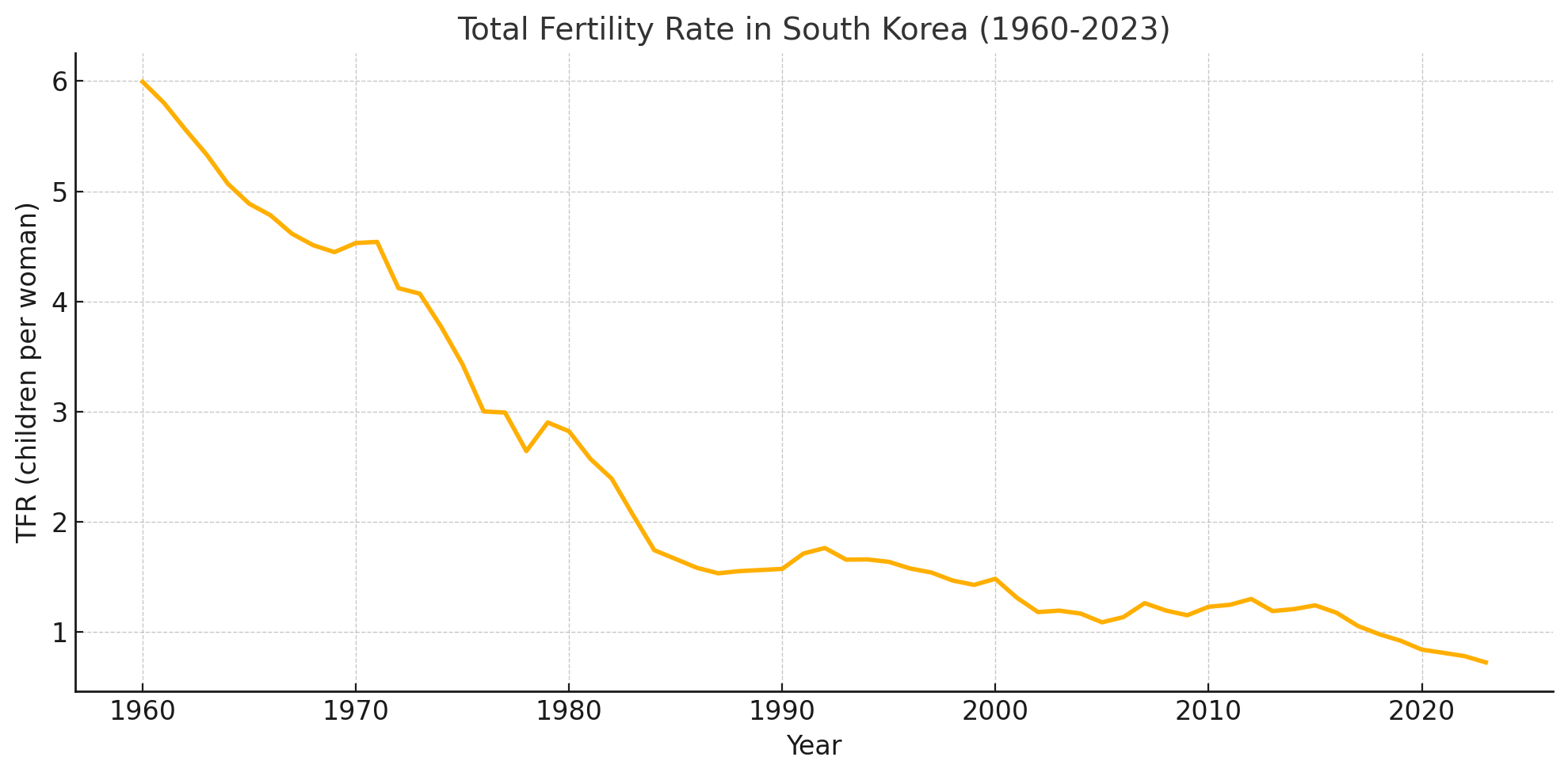 그림 1: 대한민국의 합계출산율 추이 (1960년대 ~ 2024년). 1960년대에는 여성 1인당 평균 5명이 넘는 자녀를 낳았으나, 2024년 현재 0.68명 수준까지 급감하였다. 이는 전 세계에서 전례 없이 빠른 속도로 진행된 저출산 추세로, 한국은 OECD 국가 중 유일하게 출산율이 0명대에 머물고 있다.