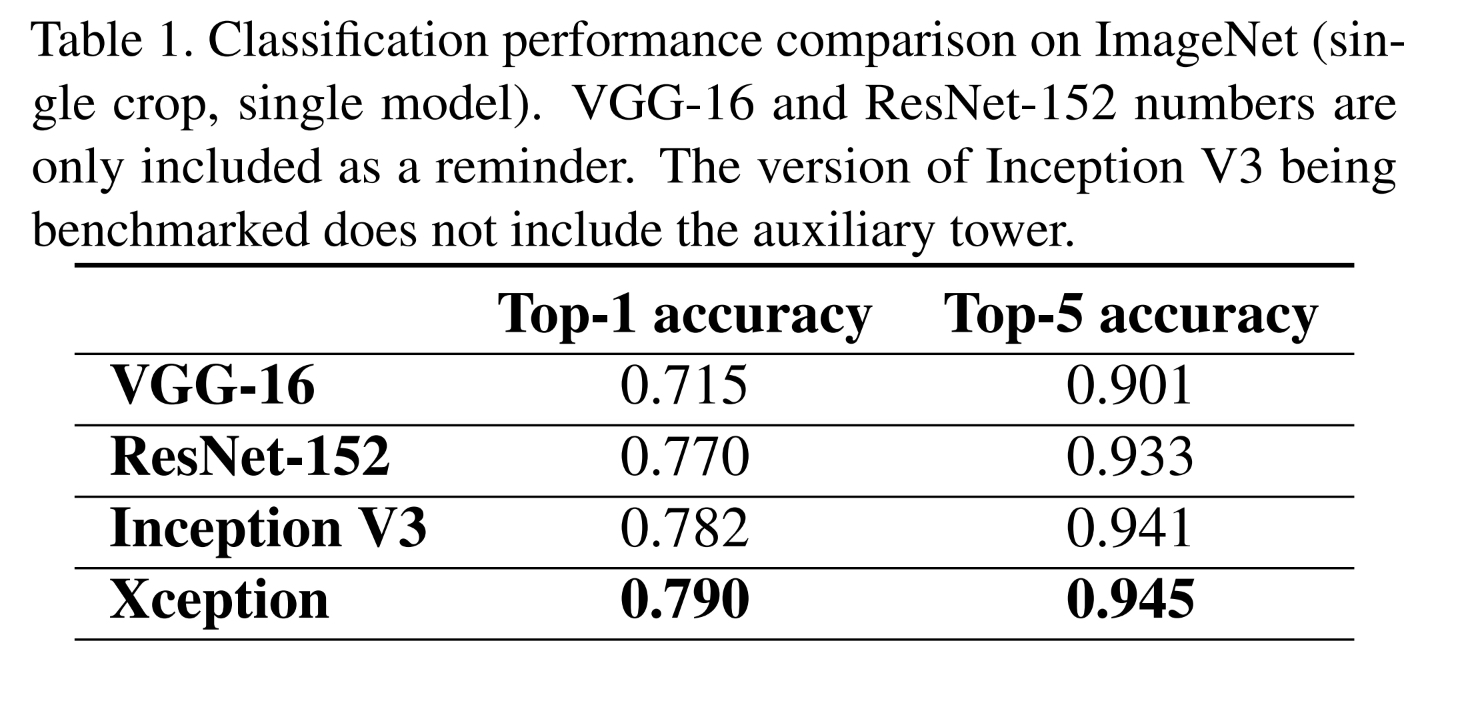 주로 Xception과 Inception V3를 비교한다. 모델의 scale이 거의 비슷하기 때문이다.