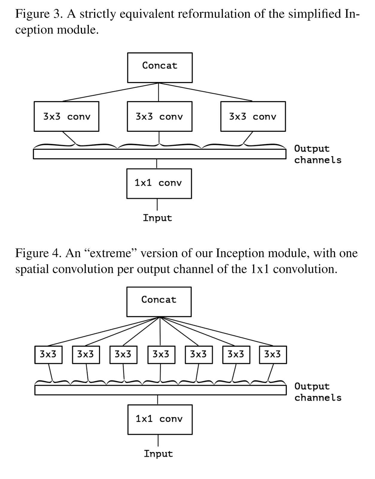 위에서 설정한 가설을 확인하기 위해 ‘extreme’한 Inception 모듈을 만들었다. 1x1 conv를 통해 채널을 모두 나누고 그 결과에 각각 3x3 conv를 취하는 것이다. Figure 4. 는 이를 표현하고 있다. Figure 3. 의 컨셉을 더욱 ‘extreme’하게 만든 모형이 된다.