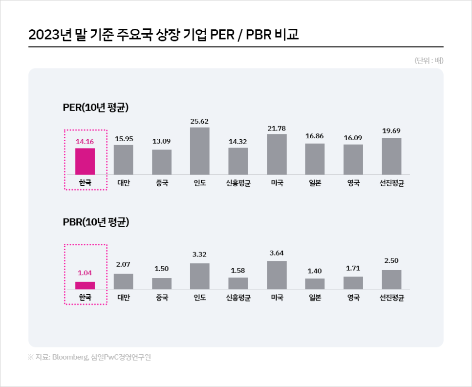 2023년 말 기준 주요국 상장 기업의 PER/PBR 비교. 한국의 PER과 PBR은 신흥국 평균은 물론 선진국 대비 크게 낮아, 한국 증시의 저평가 현상을 보여준다.