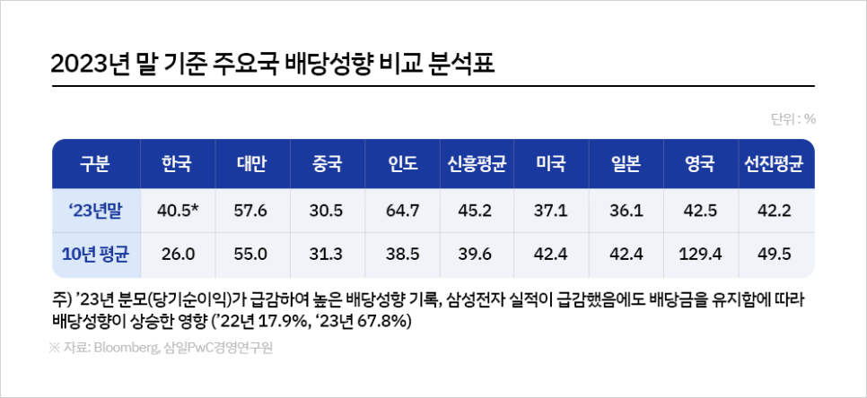 2023년 말 기준 주요국 배당성향 비교. 한국의 10년 평균 배당성향은 26.0%로, 미국·일본(42%대)이나 신흥국 평균(39.6%)보다 현저히 낮다. 낮은 배당 정책이 한국 기업의 낮은 ROE 및 코리아 디스카운트의 한 요인으로 지목된다.