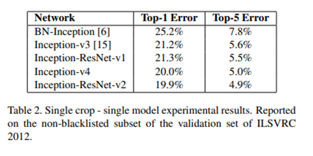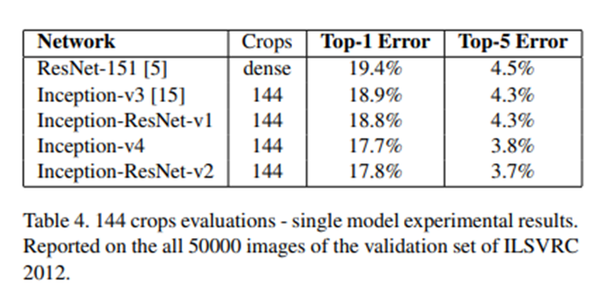 이번에는 한 개의 이미지에 대해 여러 crop들을 사용한 결과 지표이다. (Dense Crop은 1개의 이미지를 여러 개로 겹치게 자르는 것을 의미, 다른 모델들에 비해 이전 시점의 모델인 Resnet의 성능을 더 높이기 위해 한 것으로 추정) Top1 error에서 Inception-v4의 성능이 inception-resnet-v2의 성능보다 더 좋게 나온 것을 볼 수 있다. 이런 결과들을 조합하여 봤을 때 일반적으로 inception에 resenet을 더한 모델들의 학습이 더 빨리 이뤄진다. 성능적인 측면에서도 미세하게 좋긴 하지만 반드시 좋은 것은 아니라는 결론을 낼 수 있다.