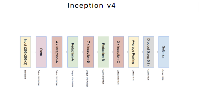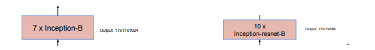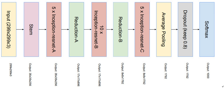 Inception-resnet-v1과 v2에 대해 살펴보면 inception-v4와 구성이 같지만 inception module이 Inception-resnet-A 등과 같이 바뀌었음을 알 수 있다.