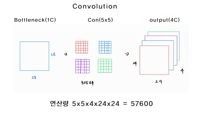 연산량은 input kernel에 대한 연산량 1x1x3 =3 이 Covolution 연산이 feature map의 크기만큼 반복되니 3x28x28 = 2352가 된다.