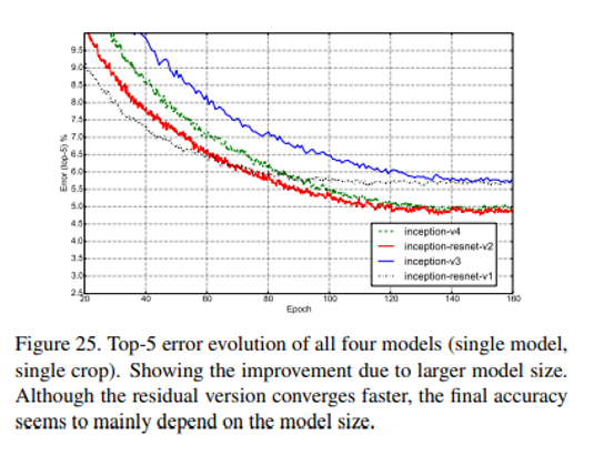 Ensemble을 하지 않고 Single Crop에 대한 Top-5 Error 성능 지표이다. 상대적으로 파라미터 수가 적은 Inception-v3, Inception-resnet-v1들의 최종 성능이 더 좋지 않은 걸 볼 수 있고 resnet을 이용한 모델들의 학습 속도가 더 빠른 것도 확인할 수 있다.