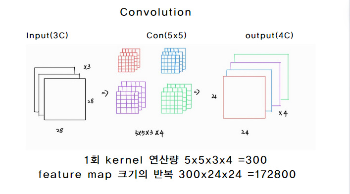 사진은 3차원 28x28 이미지에 5x5 Convolution 연산을 적용하여 4개의 채널을 만드는 과정을 나타낸다. 먼저 output channel 하나를 만드는데 input channel 수만큼의 Convolution Filter가 필요할 것이므로 5x5x3 이고 output channel이 4개 이므로 5x5x3x4 = 300이 된다. 28x28 feature map에 5x5연산을 적용하면 output의 feature map은 24x24 ( (28-(5-1))*(28-(5-1)) ) 의 크기를 가질 것이다. 채널이 합쳐진 output pixel 하나가 의미하는 것은 12개의 convolution filter 한 번의 연산이므로 300x24x24= 172800의 연산량을 갖게 된다.