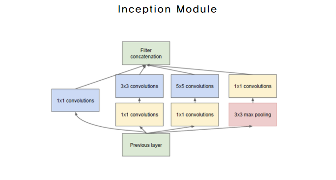 1x1 Convolution의 역할을 본 후 Inception Module을 살펴보면 차원 축소와 Non Linearity를 더했으며 서로다른 Receptive Field에서 얻는 정보를 활용한다는 것을 알 수 있을 것이다.