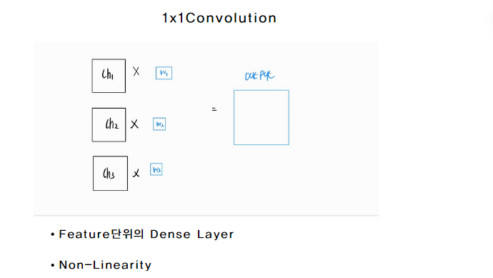 Model 전체적인 과정에서 연산량을 줄이기 위해 위 사진처럼 3차원 이미지를 1차원으로 줄이기도 하지만 필요한 경우 오히려 차원을 늘리는 역할도 한다. 1x1 Convolution이 단순히 연산량을 줄이기 위해서라기 보다는 조금 더 확장적인 의미로 파악하는 것이 더 좋을 것이다. 위 그림은 추가적인 설명을 위해 가져온 것이다. 1x1 Convolution Filter각각을 Feature Map 각각의 가중치로 보면 이는 Feature map 단위의 Dense Layer라고 볼 수 있다. 가중합 후에 Convolution 역시 activaiton function을 활용할 수 있기 때문에 Dense Layer 처럼 모델의 정교함을 더할 수 있기 때문에 더욱 그렇다.