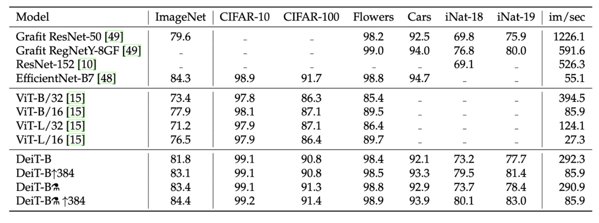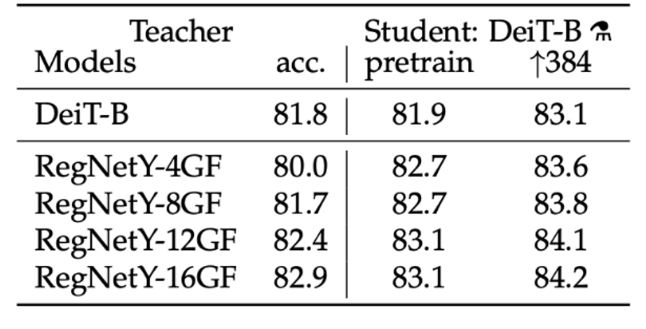 - DeiT-B의 정확도 81.8%과 거의 비슷한, 심지어 조금 낮은 CNN 모델인 RegNetY-8GF를 teacher model로 사용했을 때 더 큰 정확도를 가지는 것을 확인할 수 있음