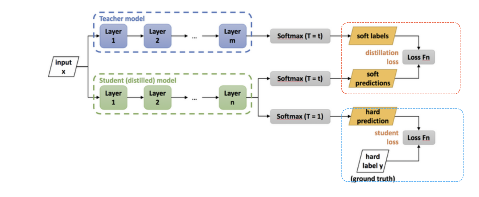 - 빨간색 박스는 student 모델과 teacher 모델의 softmax 값 차이를 cross entropy loss로 계산하여 학생 모델이 교사 모델을 모방할 수 있도록 하는 방식
