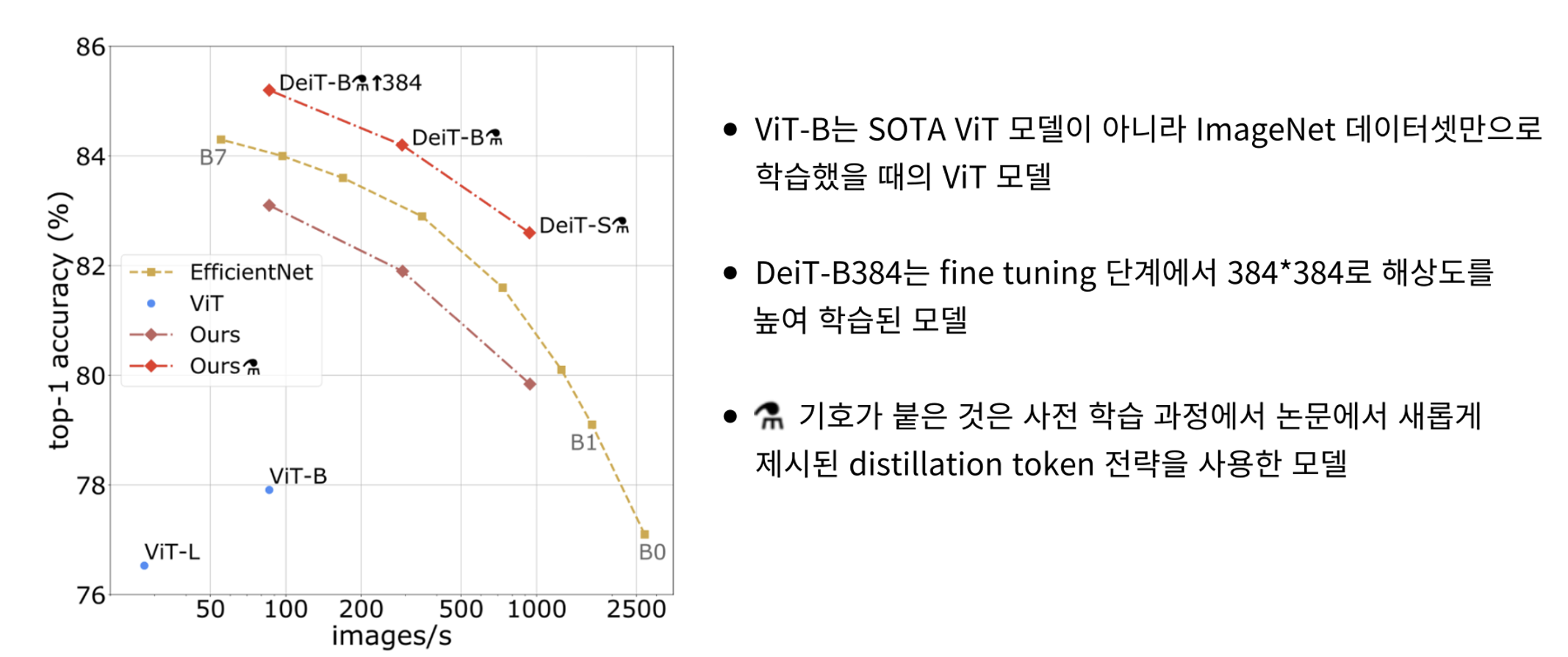 - ImageNet1k 데이터셋으로 훈련된 CNN 기반의 분류 모델 efficientNet 모델과의 성능 비교 그래프