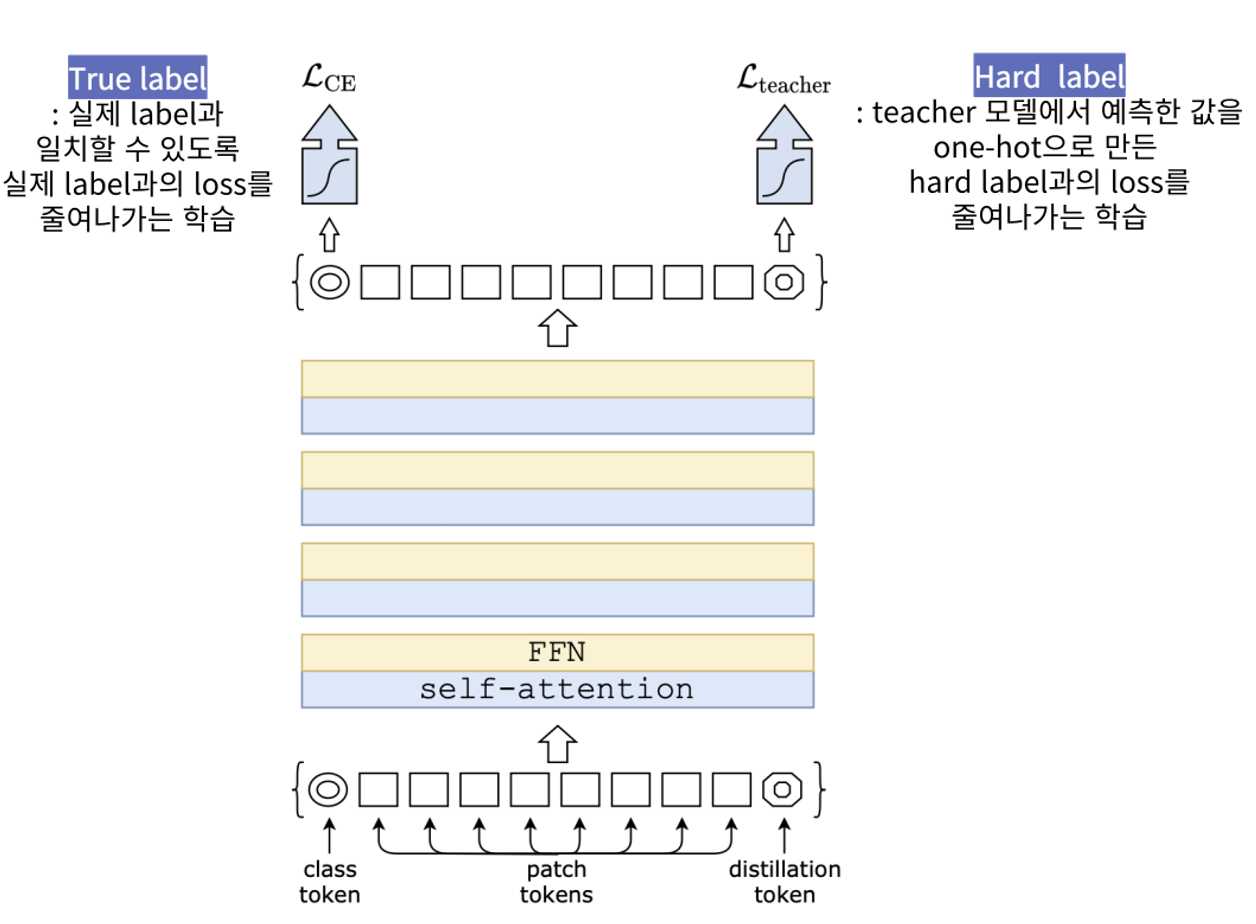 - class token은 true label과 일치할 수 있도록 loss를 줄여 나가는 방식, distillation token은 teacher model에서 예측한 softmax 값을 argmax한 hard label과의 loss를 줄이는 방식