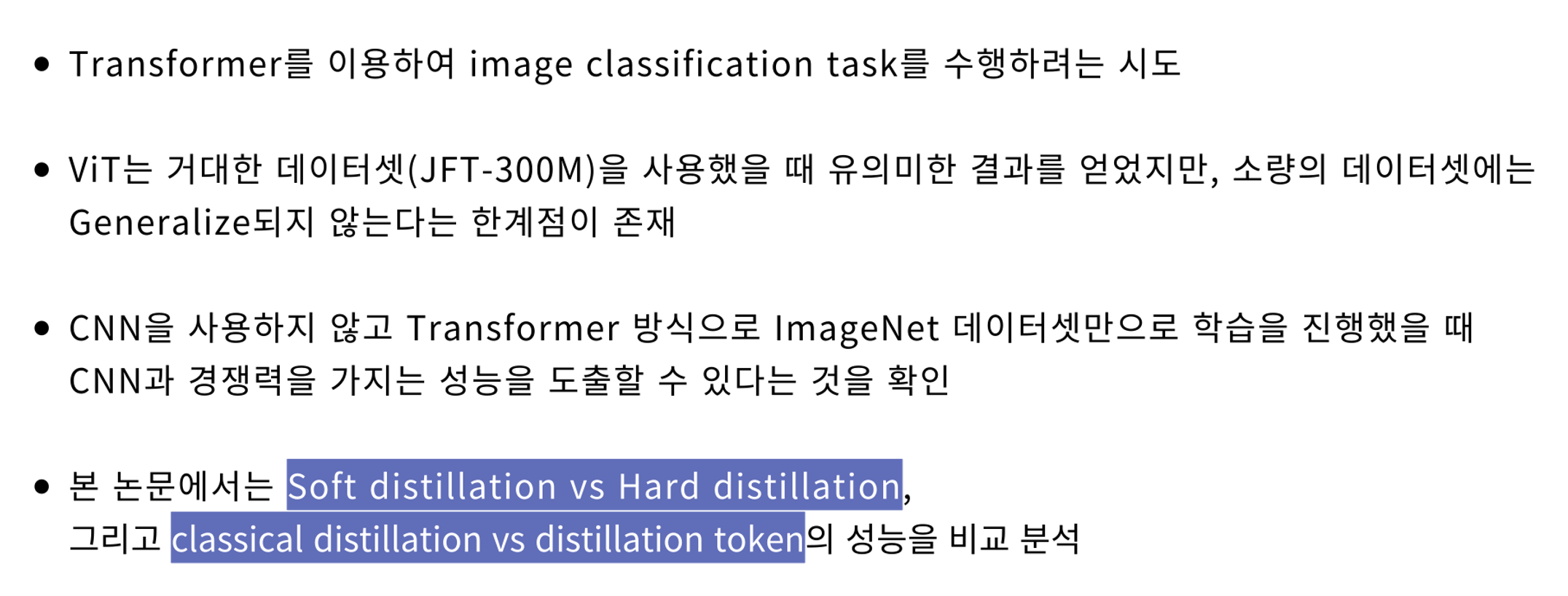 - DeiT는 2020년 12월 경에 나온 논문으로, ViT가 거대한 데이터셋에서만 유의미한 결과를 얻을 수 있다는 한계점을 해결하기 위해 데이터와 컴퓨팅 자원을 효율적으로 사용할 수 있는 knowledge distillation 기법을 통해 모델을 효율적으로 학습시키고자 했다.