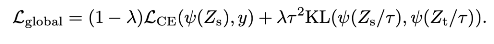- 왼쪽항은 student model의 output과 ground truth와의 cross entropy 값, 오른쪽 항은 student와 teacher의 softmax 값을 temperature parameter을 사용하여 smoothing 한 후 KL divergence를 구하여 loss 값을 도출해내는 방식