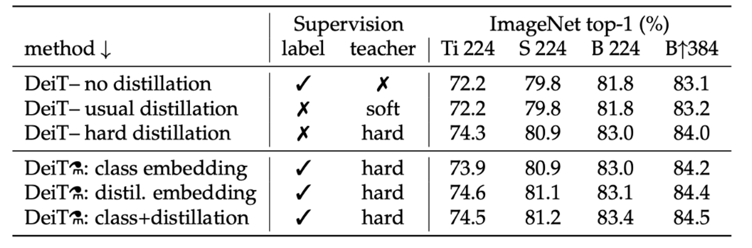 - 이 실험을 통해 hard distillation의 성능을 입증하였기에 후술되는 distillation 방식은 모두 hard label을 사용