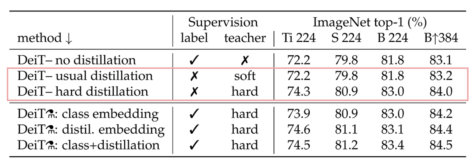 - soft label을 이용한 distillation과 hard label을 이용한 distillation 중 hard방식이 더 좋은 성능을 보임
