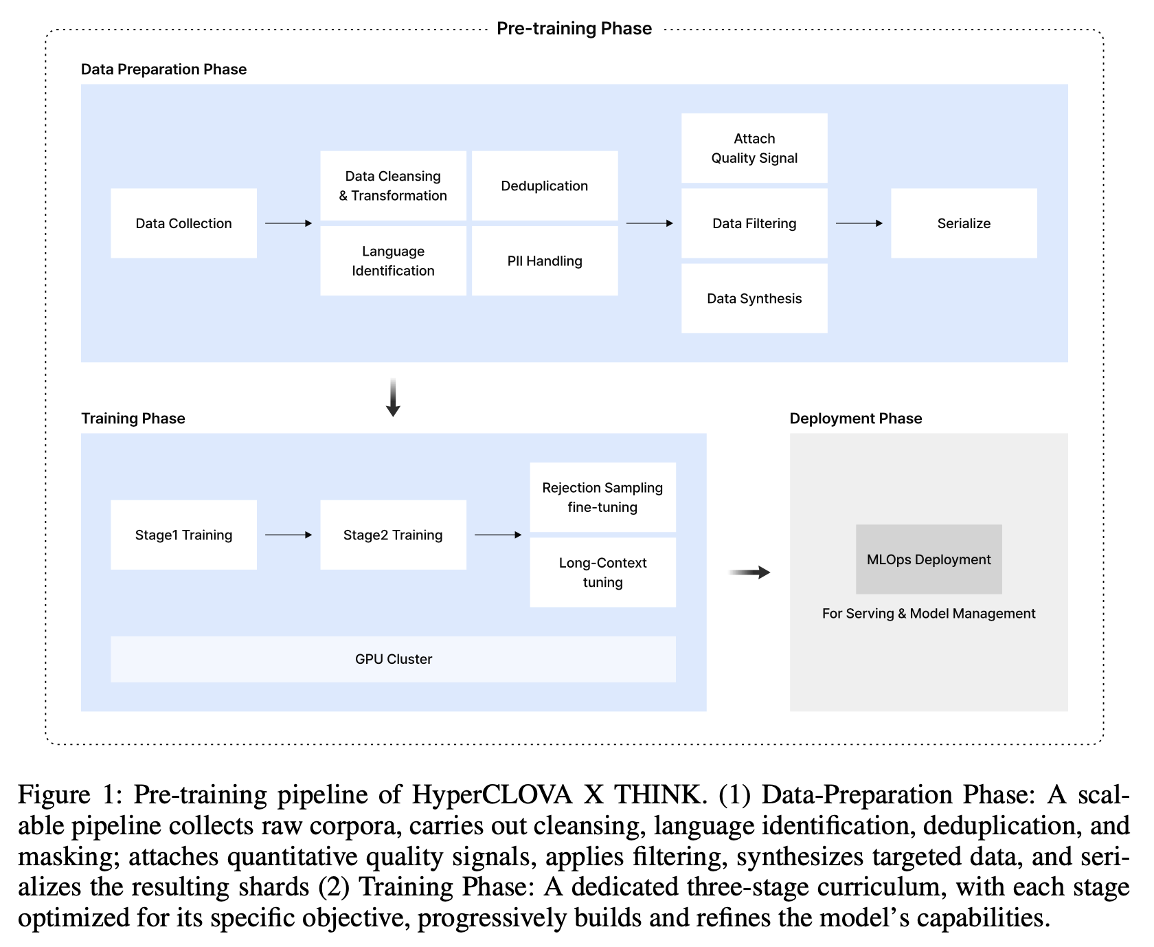 - 데이터 파이프라인: 확장성, 재사용성, 빠른 갱신을 목표로 설계되었으며, 스키마 표준화와 품질 평가 및 필터링이 분리되어 있습니다. 원시 문서는 경량화된 정제, 필드명 표준화, 통합 스키마 저장을 거치며, 이후 구조적 및 언어적 지표를 포함한 정량적 품질 신호가 첨부되고 개인 식별 정보(PII)가 마스킹됩니다. 필터링 단계에서는 임계값 규칙이 적용되어 최적화된 샤드 파일로 직렬화됩니다.