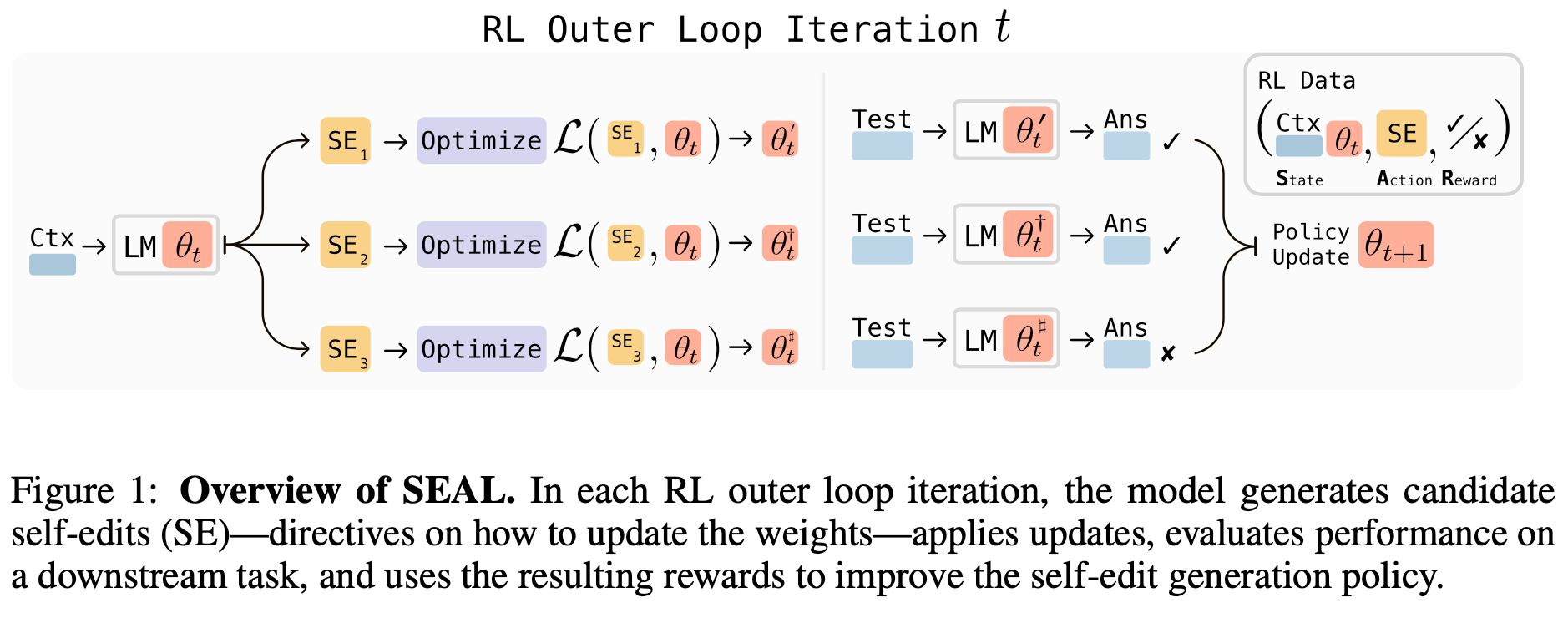 • SEAL은 모델이 효과적인 자기 편집을 생성하는 방법을 학습하는 메타 학습(meta-learning)의 한 예시로 볼 수 있습니다. 궁극적으로 모델 자체의 생성 능력을 활용하여 적응 프로세스를 파라미터화하고 제어합니다.