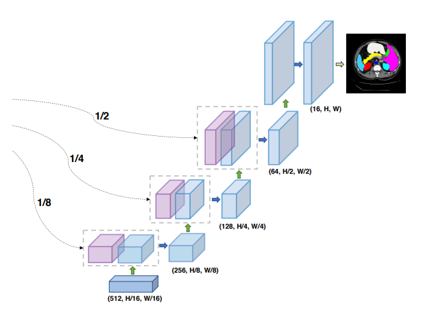 - 1 upsample : H = 1/16*H , 1/16*W = W, C = 512 -> H = 1/8 *H=, W = 1/8 *W, C = 128