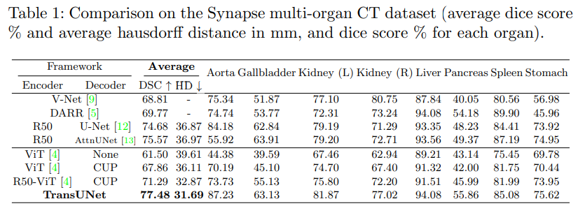 - 당시의 SOTA모델들과의 비교실험을 통해 TransUNet의 성능을 입증함.