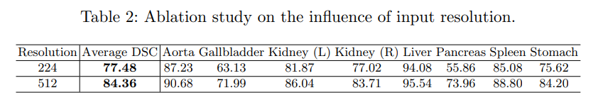 - input size에 대하여 224, 512를 비교한 지표로, size를 512로 하였을 때 224 대비 약 6%성능이 높은 것을 확인.