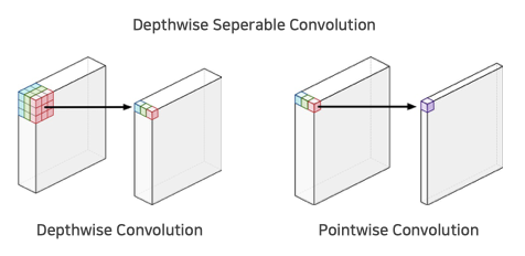 Depthwise seperable convolution은 채널별로 독립적으로 convolution 연산을 수행하는 Depthwise convolution과 1 x 1 컨볼루션으로 채널을 압축하는 pointwise convolution을 합친 것입니다. 이를 통해 연산량 (FLOPs)를 줄였습니다.