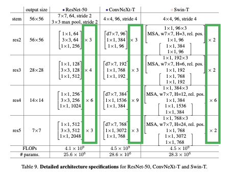 기존 ResNet의 stage 구성인 3,4,6,3 을 Swin Transformer의 1:1:3:1 비율에 맞춰서 3,3,9,3 으로 변경해주었습니다.